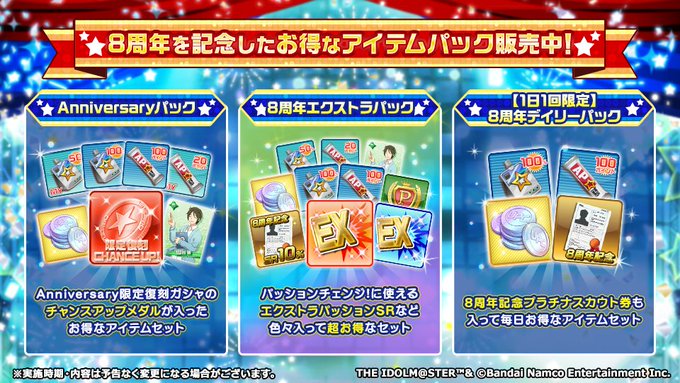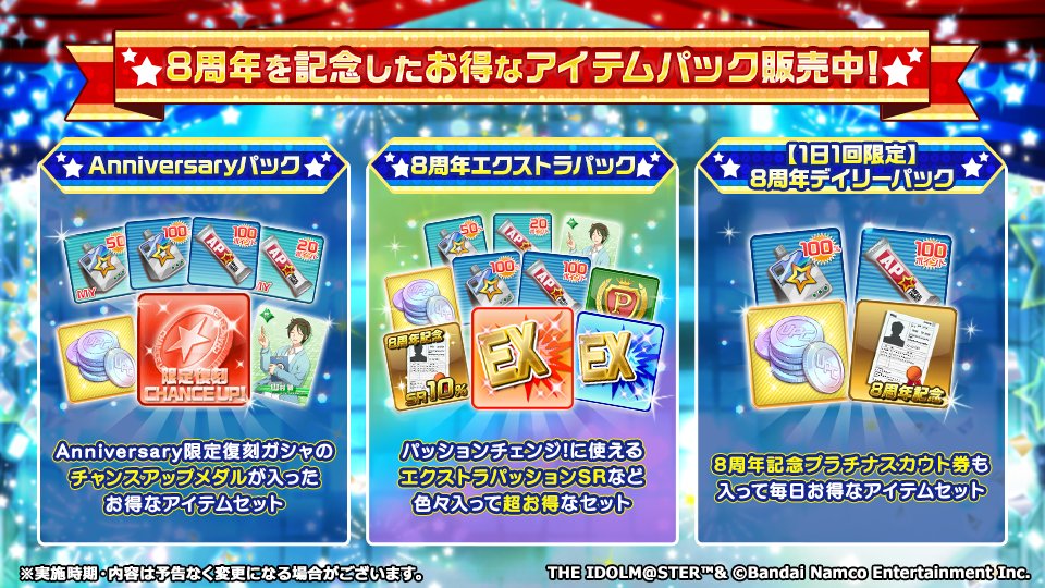 プロデューサーさん、エクストラパッションSRや8周年記念SR10%プラチナスカウト券などのアイテムがセットになった「8周年エクストラパック」など、お得なパックが数量限定で販売中です!
