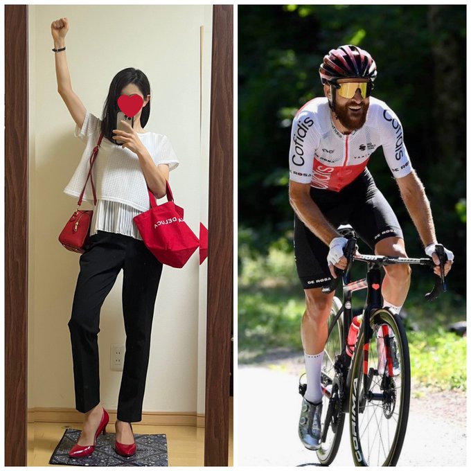 イネオスはもうやっちゃったから(笑)、今日は山岳賞ゲシュケのコフィディスコーデ🤍♥️🖤UAEと似てるけど、これは赤パンプスがポイントなのです👠