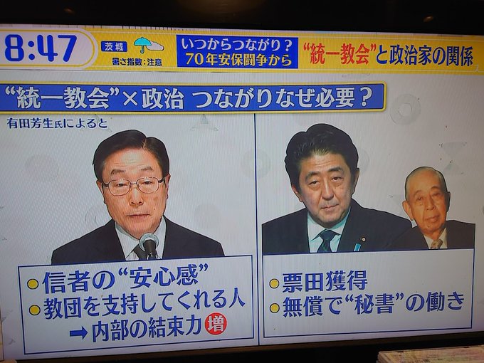スタジオ「有田氏によれば、教団側にも政治家側にもメリット。教団側には政治家がついていてくれるという安心感、支持してくれる人がいることで内部の結束力が強まる。政治家側にとっては票田獲得、無償で秘書の仕事をしてくれる。例えば葉書発送、名刺の準備、お茶くみまで」#スッキリ pic.twitter.com/cTnWSpfsk1