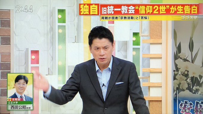 今の統一教会は安心などと旧統一教会の元2世信者の話ばかり放送していたゴゴスマ、偏った報道に立正大学の西田先生が激怒「おかしい!なんで喋らせてくれないんですか?」#西田公昭 #ゴゴスマ | まとめ部 matomebu.com/news/gogosmile…