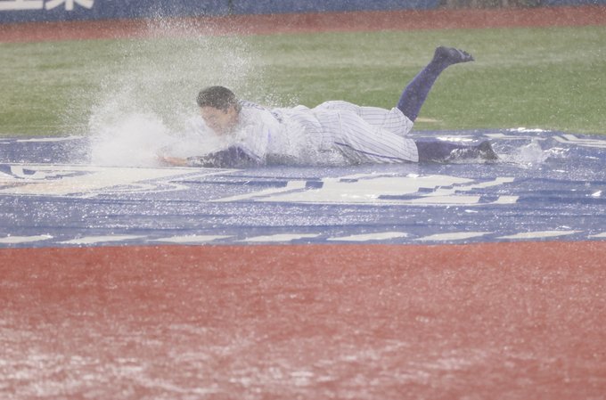 知野直人選手が、雨の中、ダイヤモンドを1周☔️