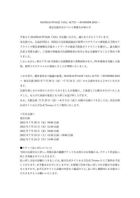 7月20日(水)~7月24日(日)東京公演中止のお知らせ