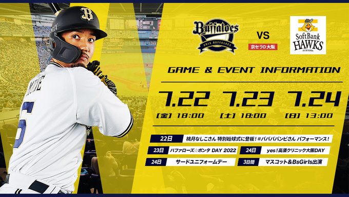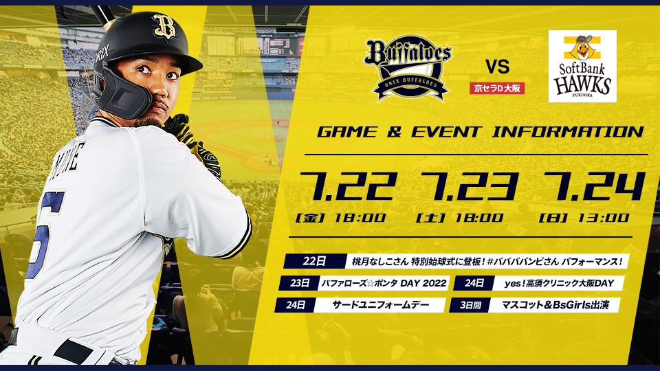 7/22(金)~24(日)京セラドーム大阪で開催される試合&イベント情報について、お知らせいたします。