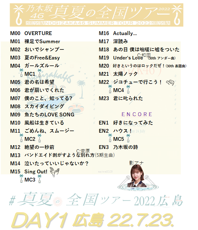 乃木坂46まとめ 1/46 : セトリも判明!ついに全編終了『真夏の全国ツアー2022@広島グリーンアリーナ 1日目』セットリスト&レポートまとめ!【#真夏の全国ツアー2022 】【#真夏の全国ツアー2022広島 】 #乃木坂46 #櫻坂46 #日向坂46