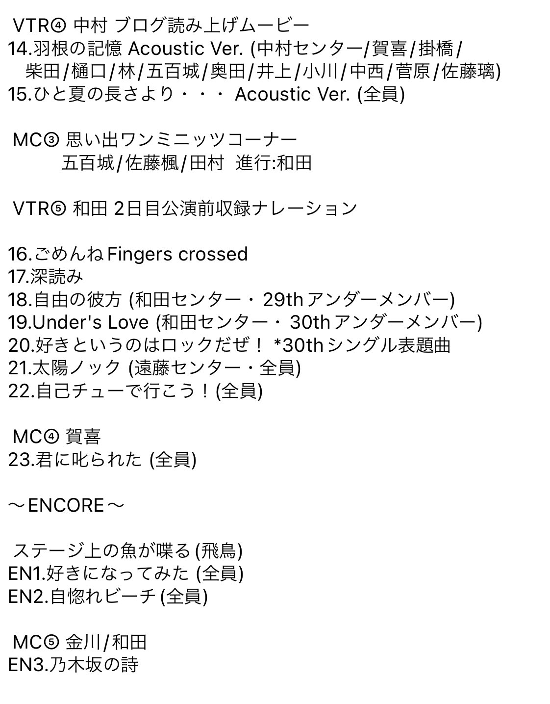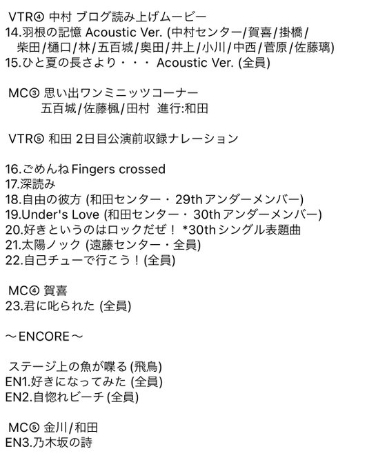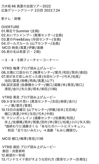 乃木坂46 #真夏の全国ツアー2022 @広島グリーンアリーナ・2日目 セットリスト!回変わりブログVTR担当は梅澤/黒見(かき氷の思い出センター)/中村(羽根の記憶センター)/奥田!和田まあやにとってのラスト凱旋公演すべて終演!まあやありがとう! #乃木坂46 #nogizaka46 #真夏の全国ツアー2022広島 pic.twitter.com/AiMYHvQh19