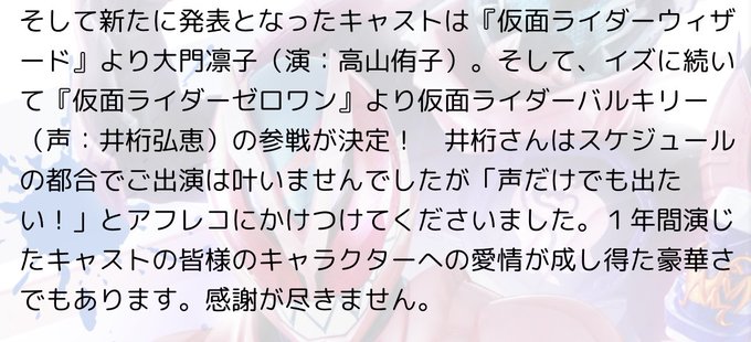 スケジュール取れなかったの今売れっ子ですからね井桁さん。でも声だけでも出たいと言ってアフレコした井桁さんに仮面ライダー愛を感じる。感謝です