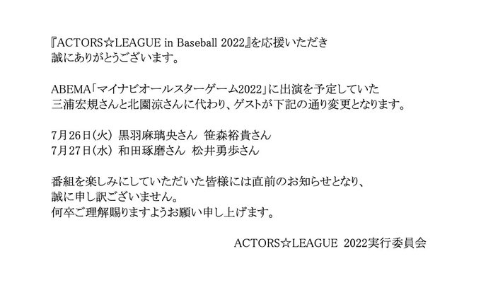『ACTORS☆LEAGUE in Baseball 2022』よりABEMA #マイナビオールスターゲーム2022 に出演を予定していた三浦宏規さんと北園涼さんに代わり、ゲストが下記の通り変更となります。