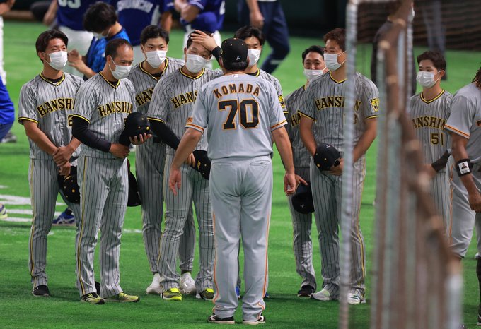 原監督の代わりでコーチとして出場する #駒田徳広 3軍監督のもとへ、阪神の選手たちがあいさつ(撮影・宮沢宗士郎、松永渉平、安部光翁)