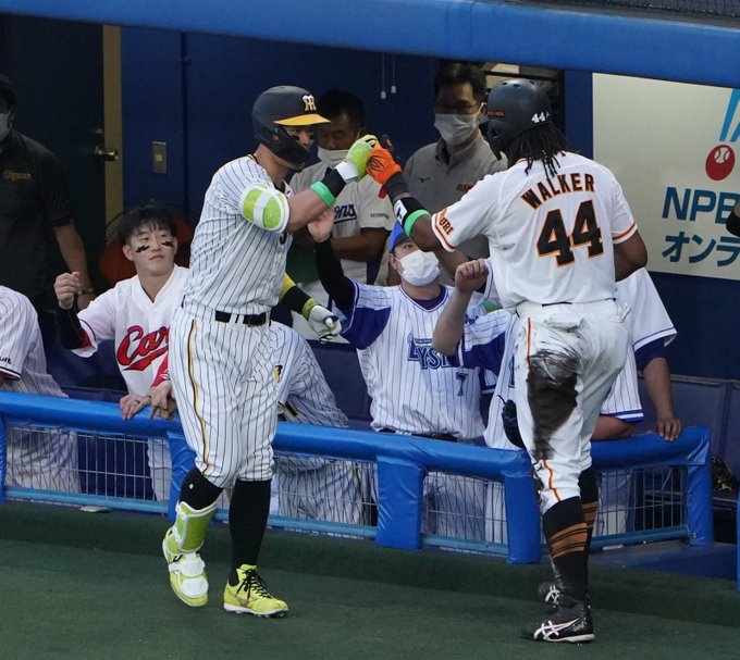#ウォーカー 選手は一回、佐藤輝明選手の犠飛で先制のホームイン!仲間とグータッチ(撮影・安部光翁、今野顕、榎本雅弘)