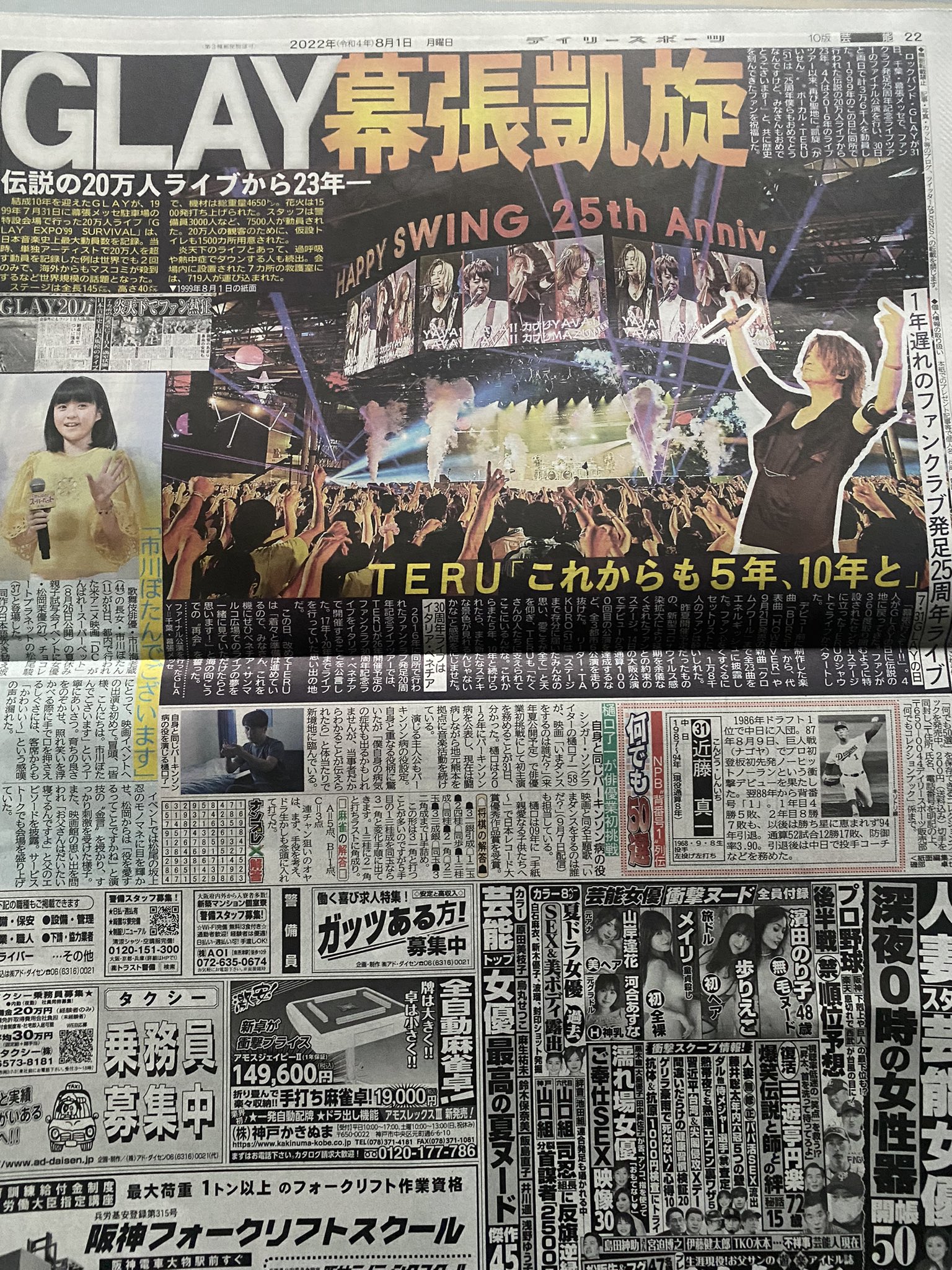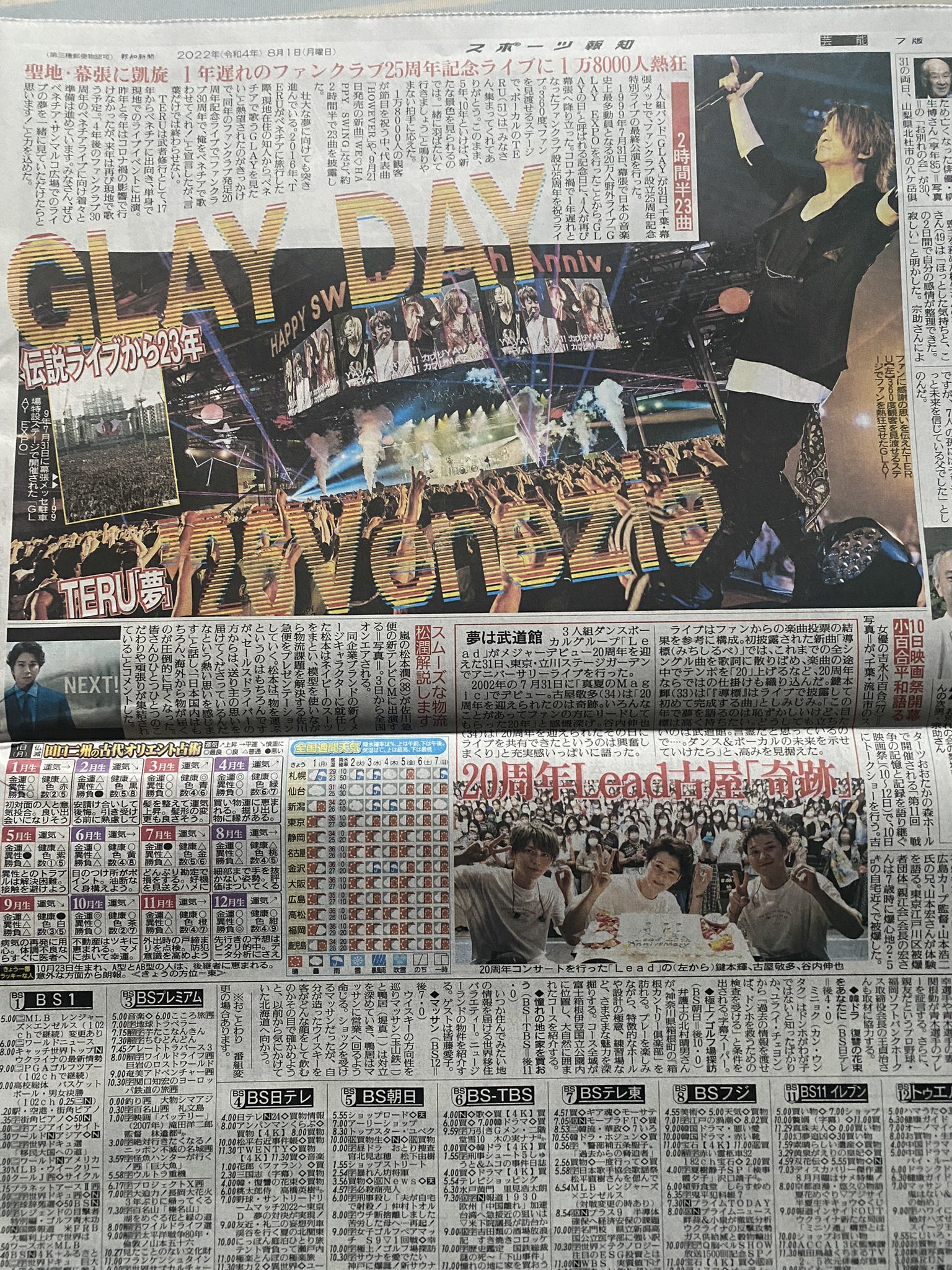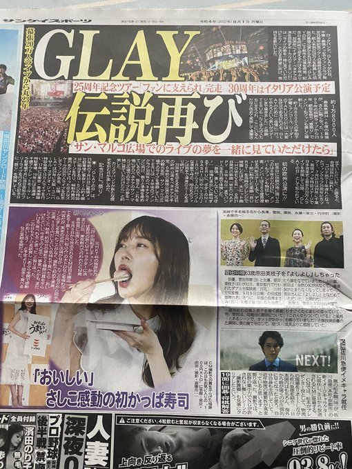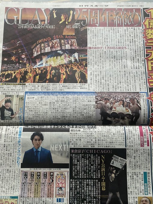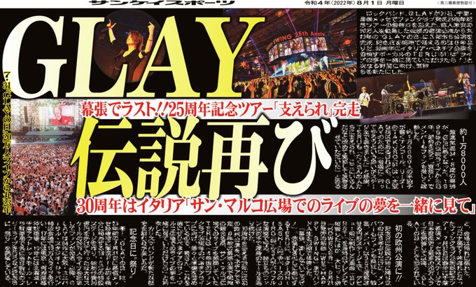 8/1 今日のスポーツ誌各社に昨日行われたGLAYの幕張メッセのライブ記事が載ってますよ。