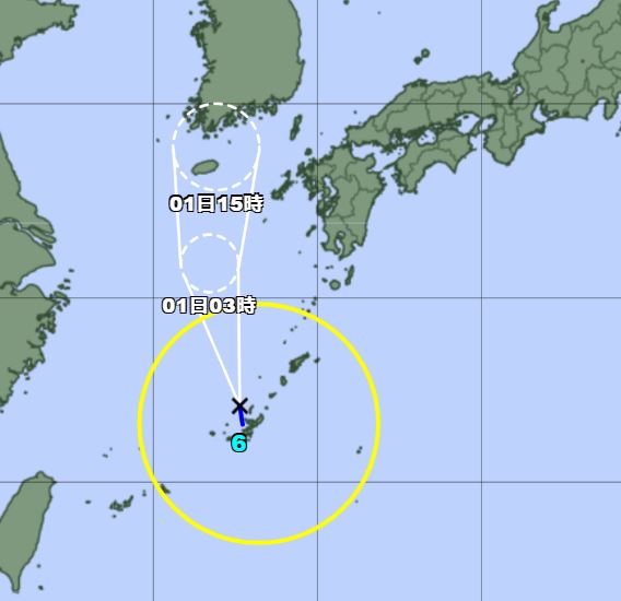 台風6号は正午に那覇市の北海上で発生し、15時には那覇市の北約100キロの海上を35キロで北北西へ。