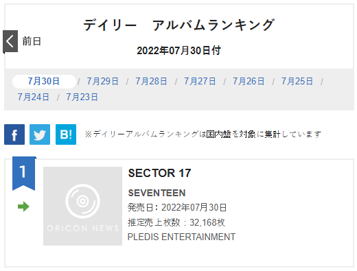SEVENTEEN 4th Album Repackage「#SECTOR17」が2022年7月31日付けオリコンデイリーアルバムランキングで3日連続の1位を獲得🎉✨