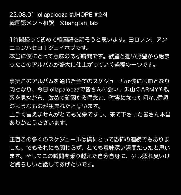 ARMYに感謝したい、そしてこの素晴らしい機会を与えてくれた Lollapaloozaの全ての主催者にもう一度感謝したいです。』