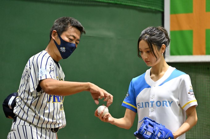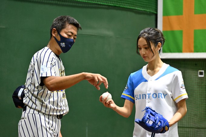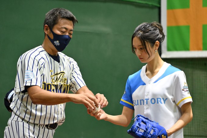 始球式を務めた #菜々緒 さんを指導する #上原浩治 さん(@TeamUehara)⚾️