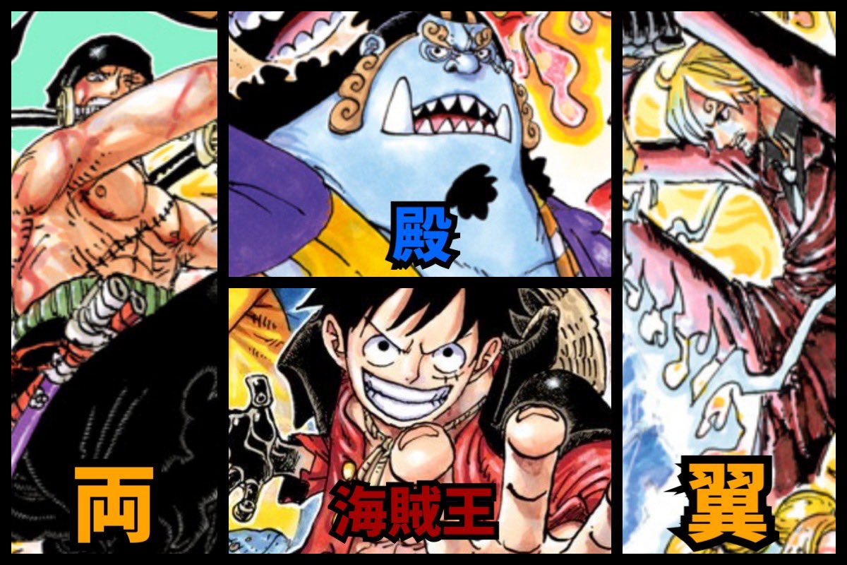 #今週のワンピ のラストページの“麦わら四強”の並びが、海賊王の両翼と殿(しんがり)になってて良きー!ってなった😆✨WCI編でも殿を務めたジンベエがこのポジションにいる安心感よ!!! pic.twitter.com/BNFhU8WWXD