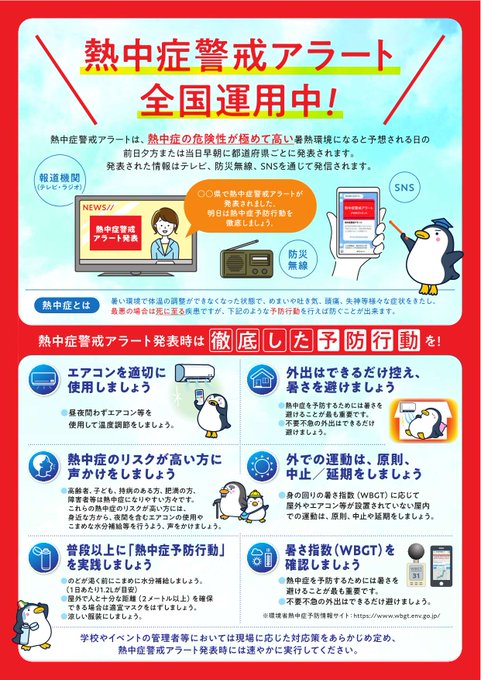 暑さ指数(WBGT)や #熱中症警戒アラート を確認し、#熱中症予防行動 を積極的に取ってください。
