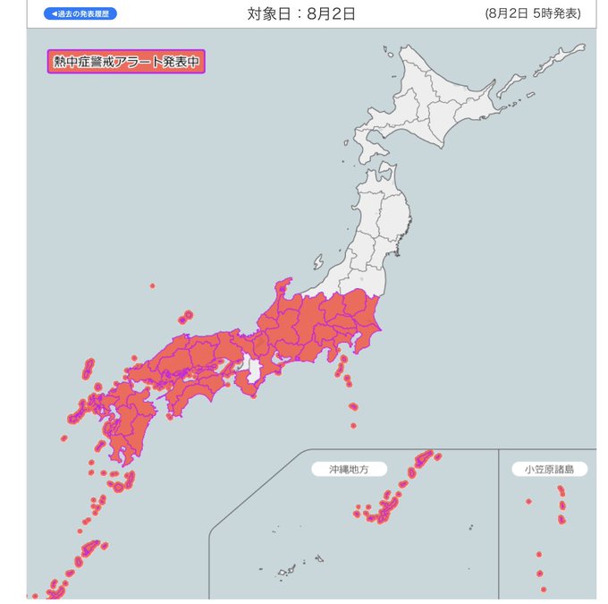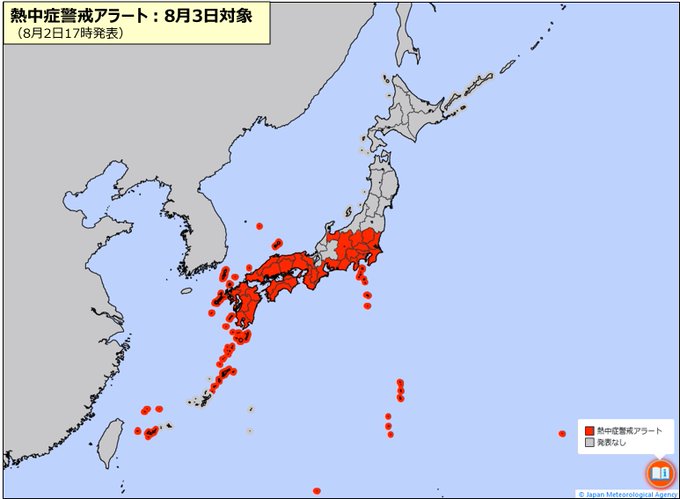 東京は朝から30℃越え。汗が噴き出てきますね。全国の広い範囲に #熱中症警戒アラート が出されています。