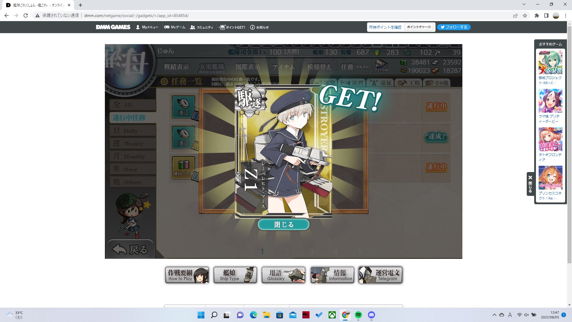 長い遠征任務を終えようやくZ1をゲットしてビスマルク狙ったら1発で出たー(ノ∀`笑)初めて大型建造勝ったかもしれん()