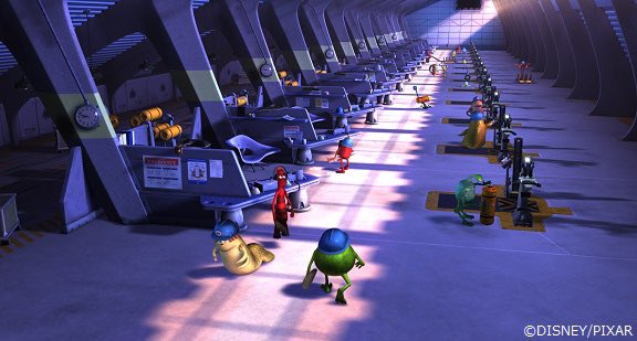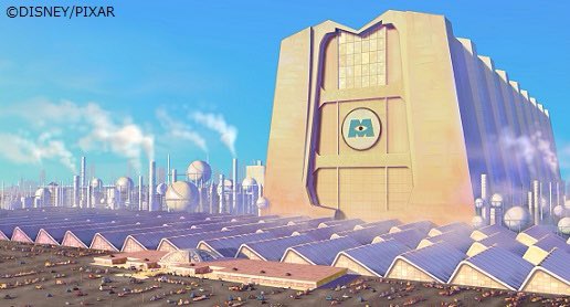 モンスターズ・インクの工場🏭は、1960年代のモダニスト風の建築物をイメージ。社長のウォーターヌースの祖父の代から続く会社なのですが、ベビーブーム時代に古い工場を建て替えたという設定でデザインされています。