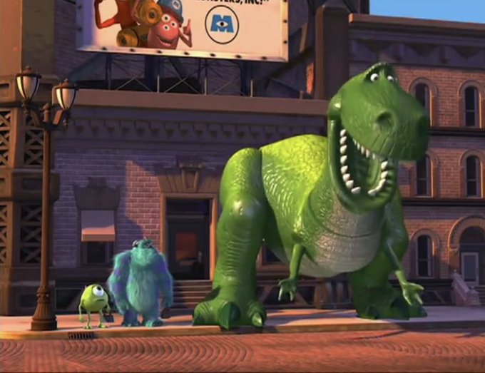 モンスターズインクに足だけ登場するこの恐竜、本当は本物のゴジラを登場させる予定だったんだけれども東宝からNGが出てテッドというオリジナルキャラが使われることになったんだそう。