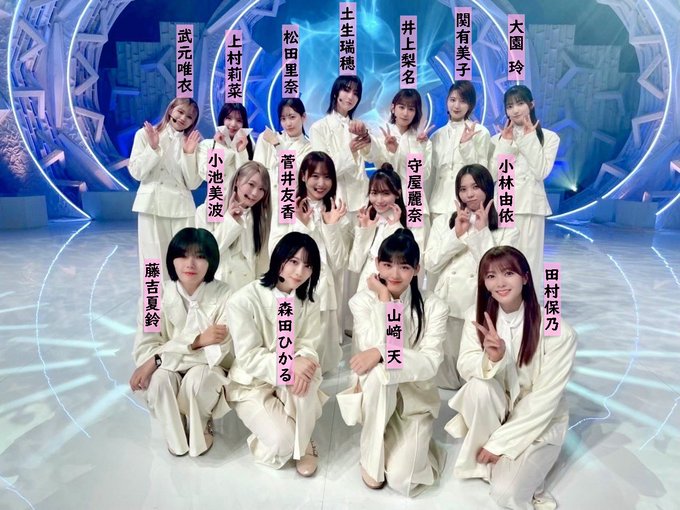 【#櫻坂46 初見の人へ】先ほど #MUSICFAIR にて「#摩擦係数 」を披露した選抜チーム(15名)の名前入り集合写真です!これ以外にも素敵なメンバーや曲が揃っています!いっしょに櫻坂全員の写真も!これを機に興味を持っていただけたら最高です!
