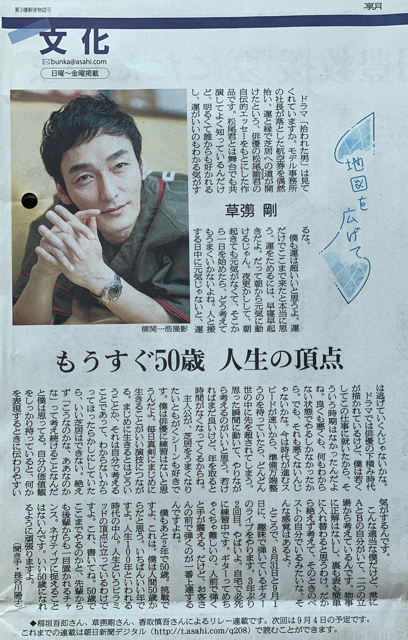 8月7日 #朝日新聞「地図を広げて」で #草彅剛 さんが #松尾諭 さん『拾われた男』にふれてくださいました。