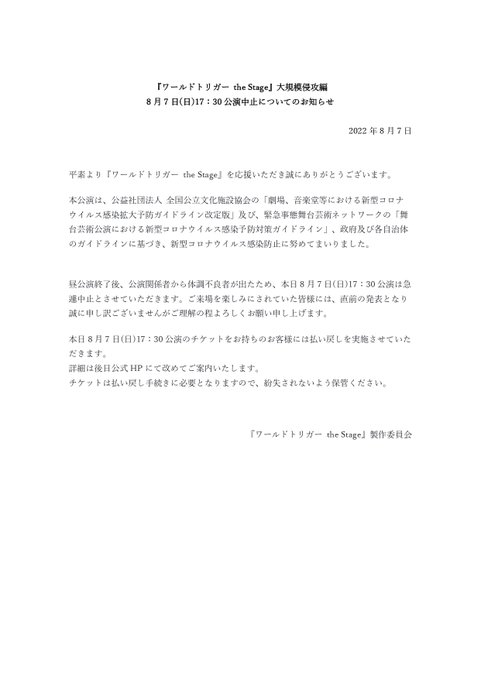 【本日17:30の回】急遽中止とさせていただきます。直前の発表となりましたこと、心よりお詫びいたします。#ワーステ twitter.com/w_trigger_stag…