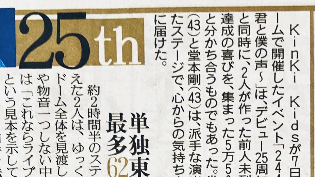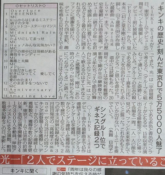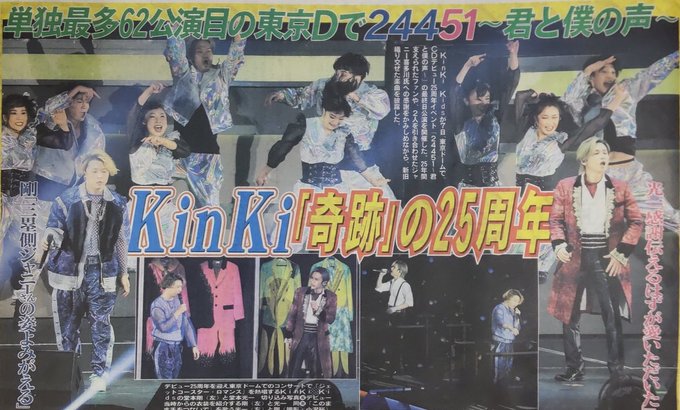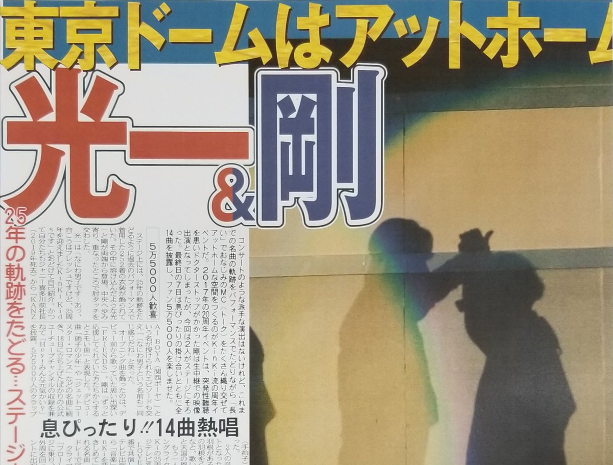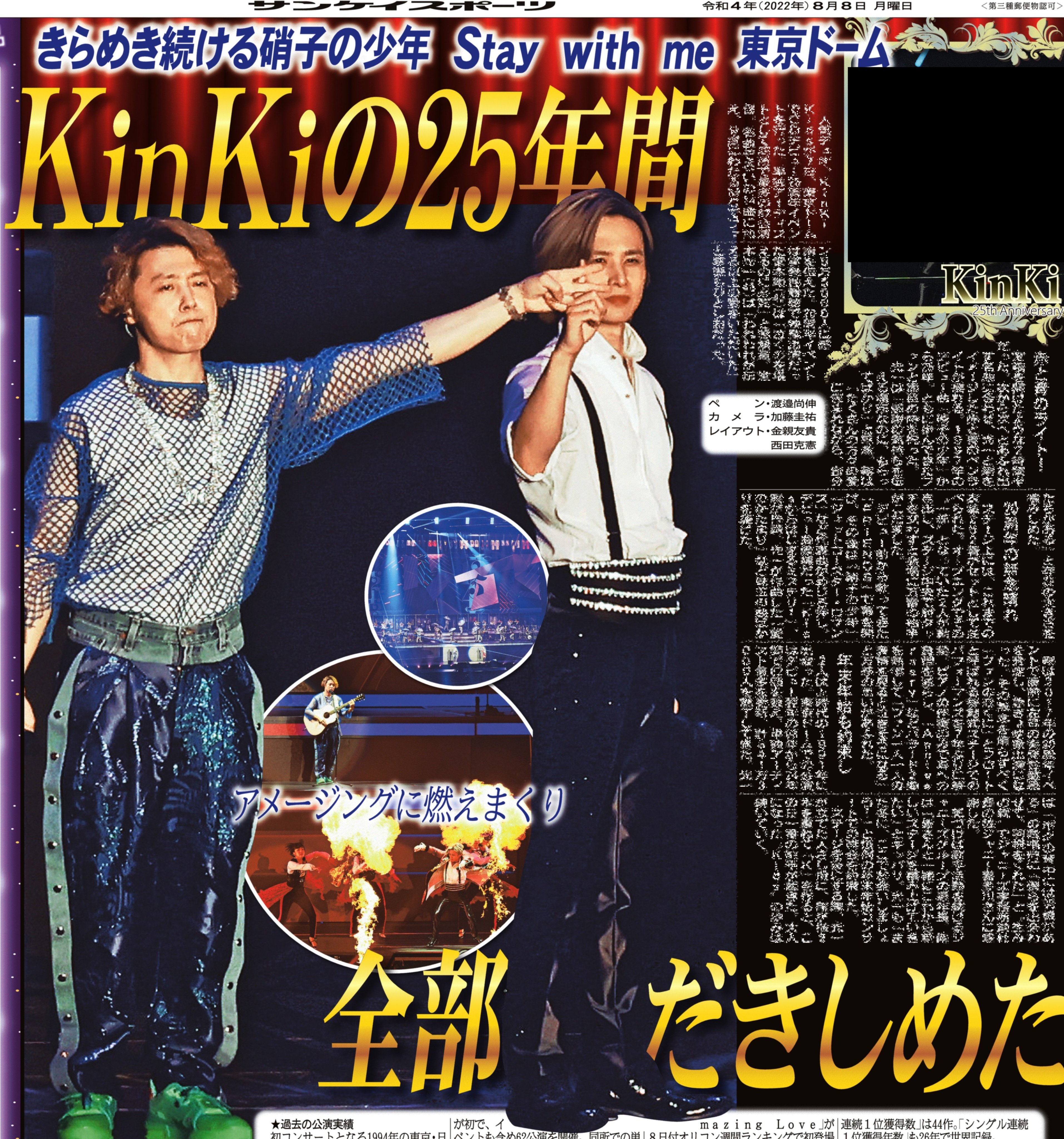 Kinki Kidsが7日、東京ドームでデビュー25周年イベントを開催。ファンに感謝を届けました。ワイドな紙面でそのようすを報じています。