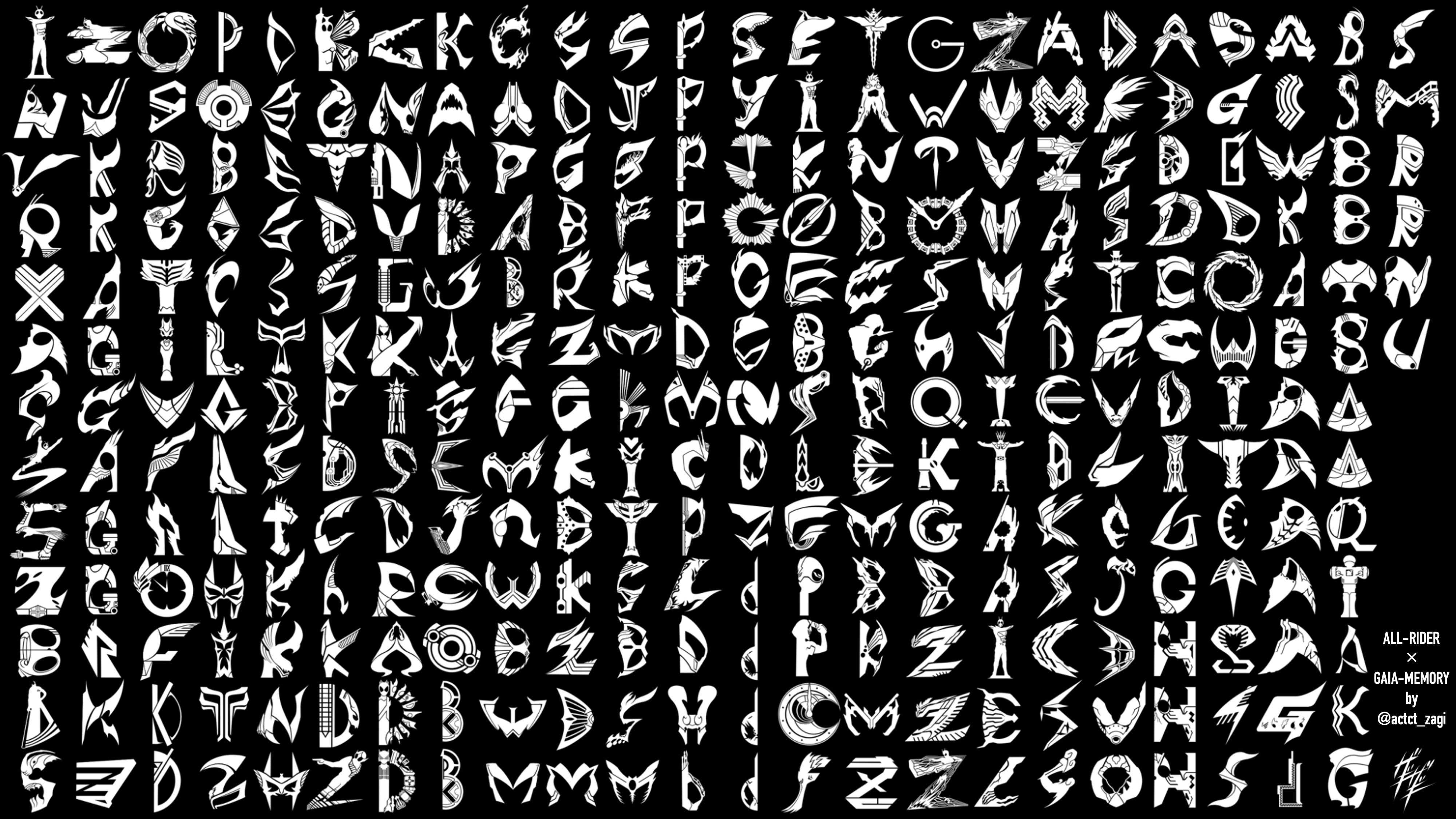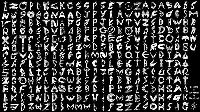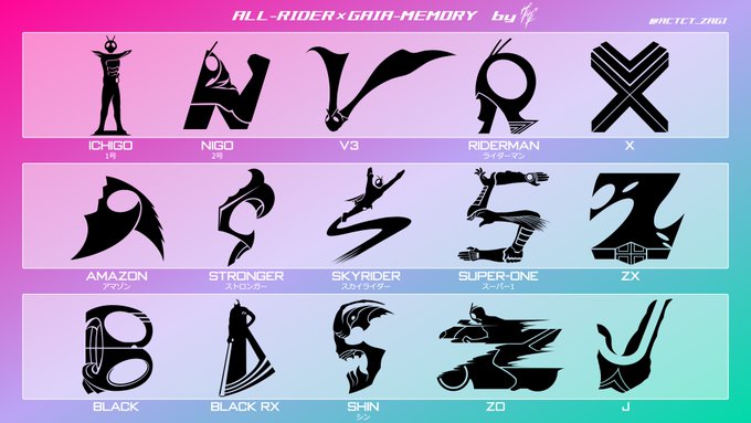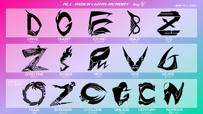 1号からギーツまでの51年間で登場した(ほぼ)全ての仮面ライダー 計305名のイニシャルをガイアメモリ風のロゴにしました。