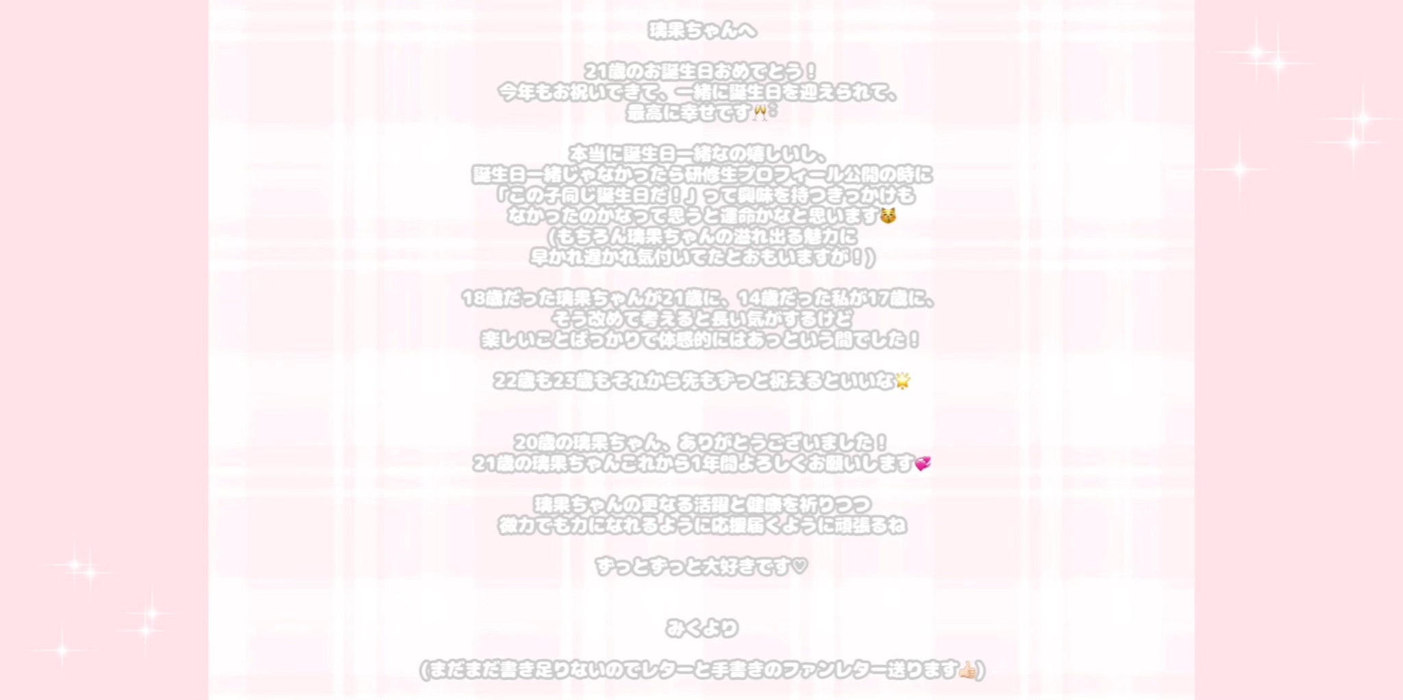璃果ちゃん21歳のお誕生日おめでとう🎉真面目なとこが好き🥰努力家なとこも好き🥰控えめでおしとやかなとこも好き🥰グイグイきてくれるギャップがあるとこも好き🥰話をじっくり聞いてくれるとこも好き🥰宇宙一可愛いとこも好き🥰急に大声だすとこも好き🥰(笑)