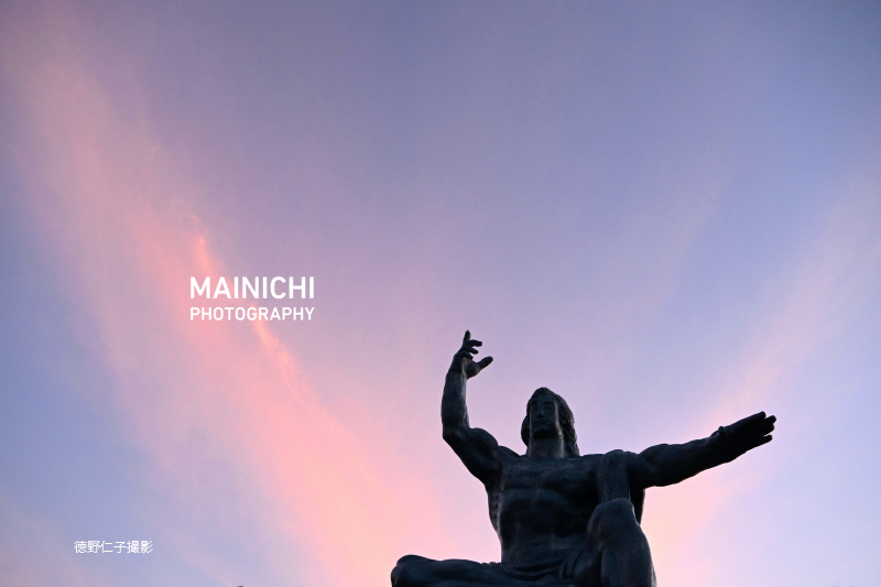 写真は朝焼けに包まれる長崎市の平和祈念像です。