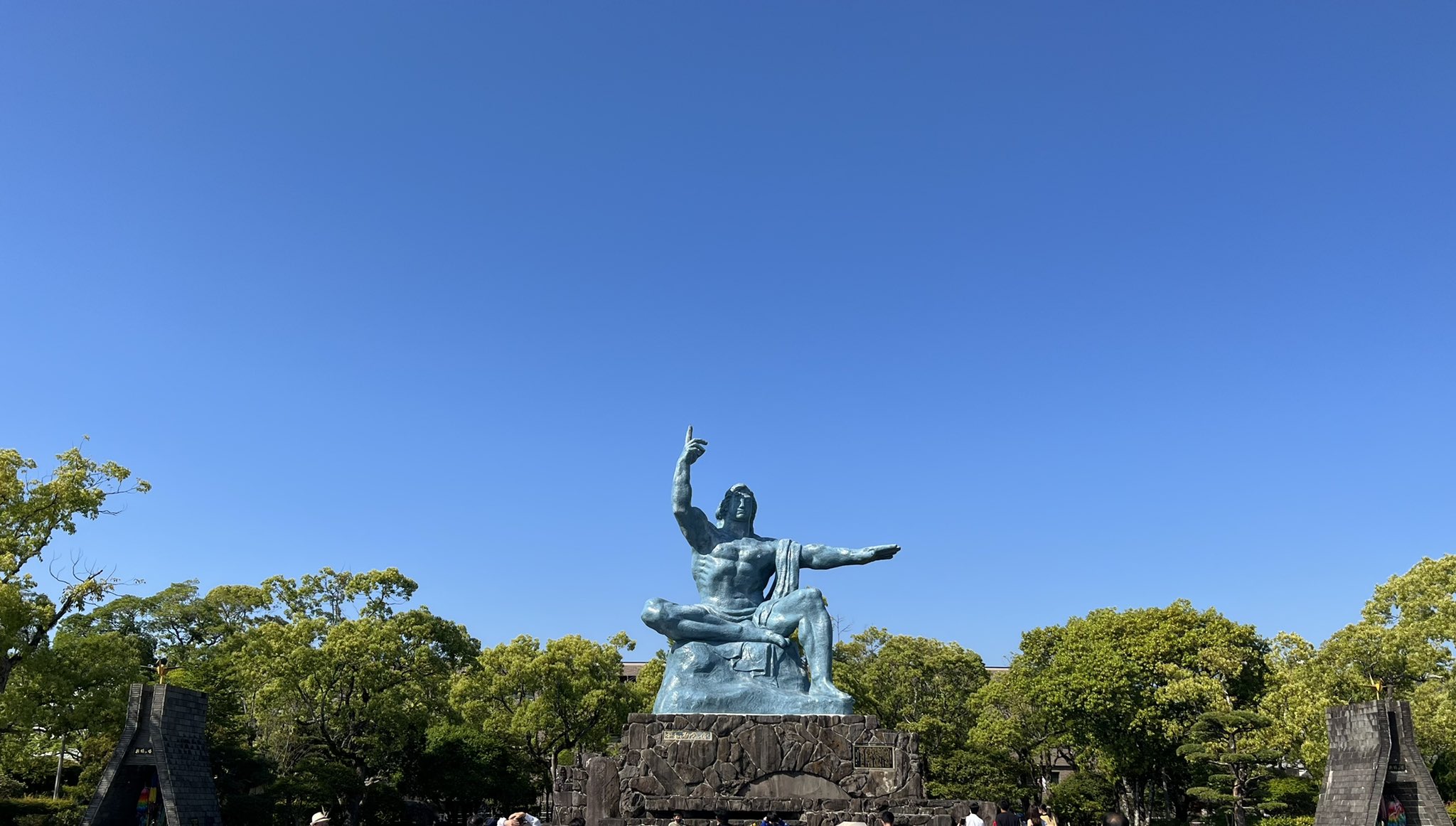 爆心地にほど近い平和公園の平和祈念像は右手で天を指し原爆の脅威を、水平に伸ばした左手で平和を表しているの