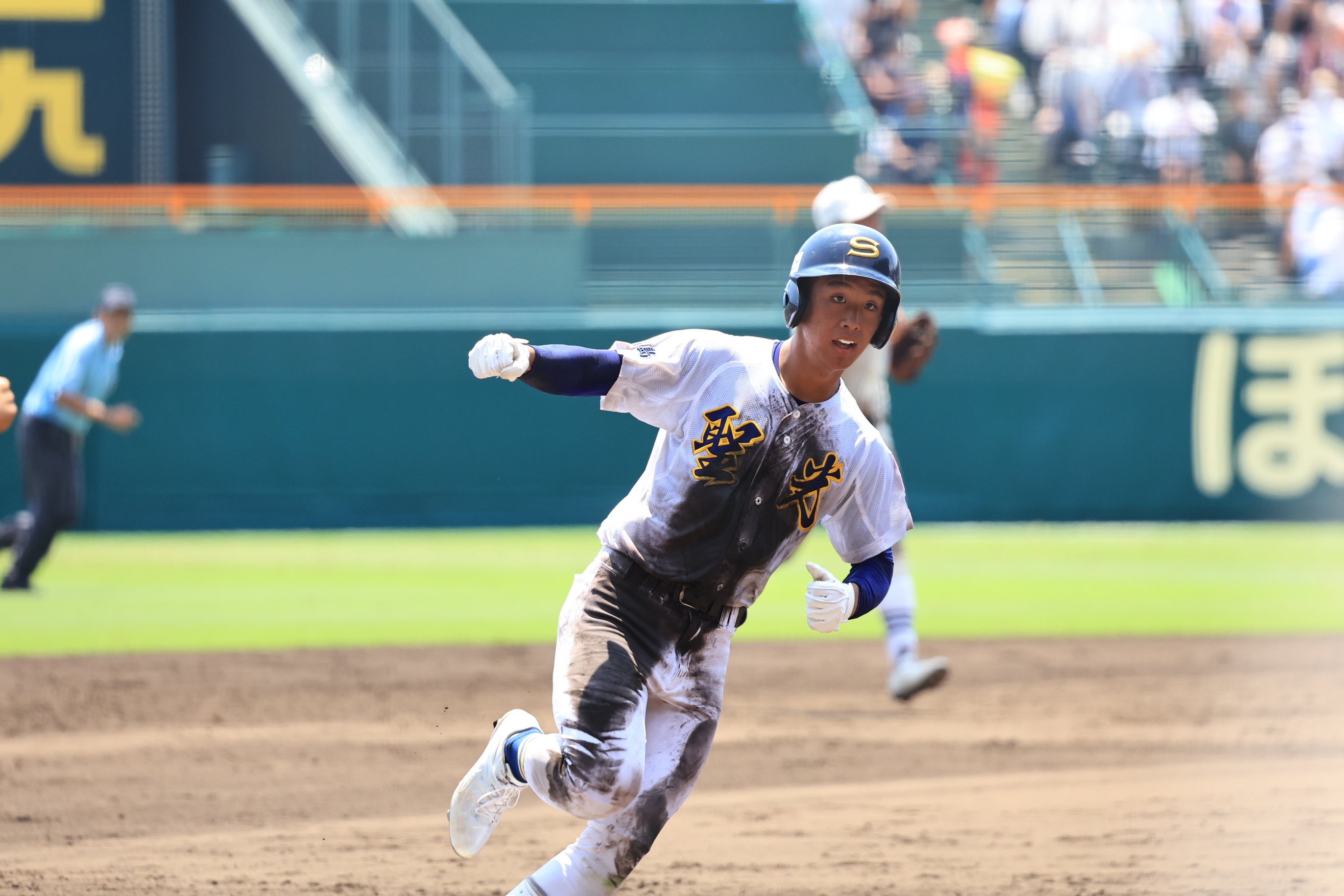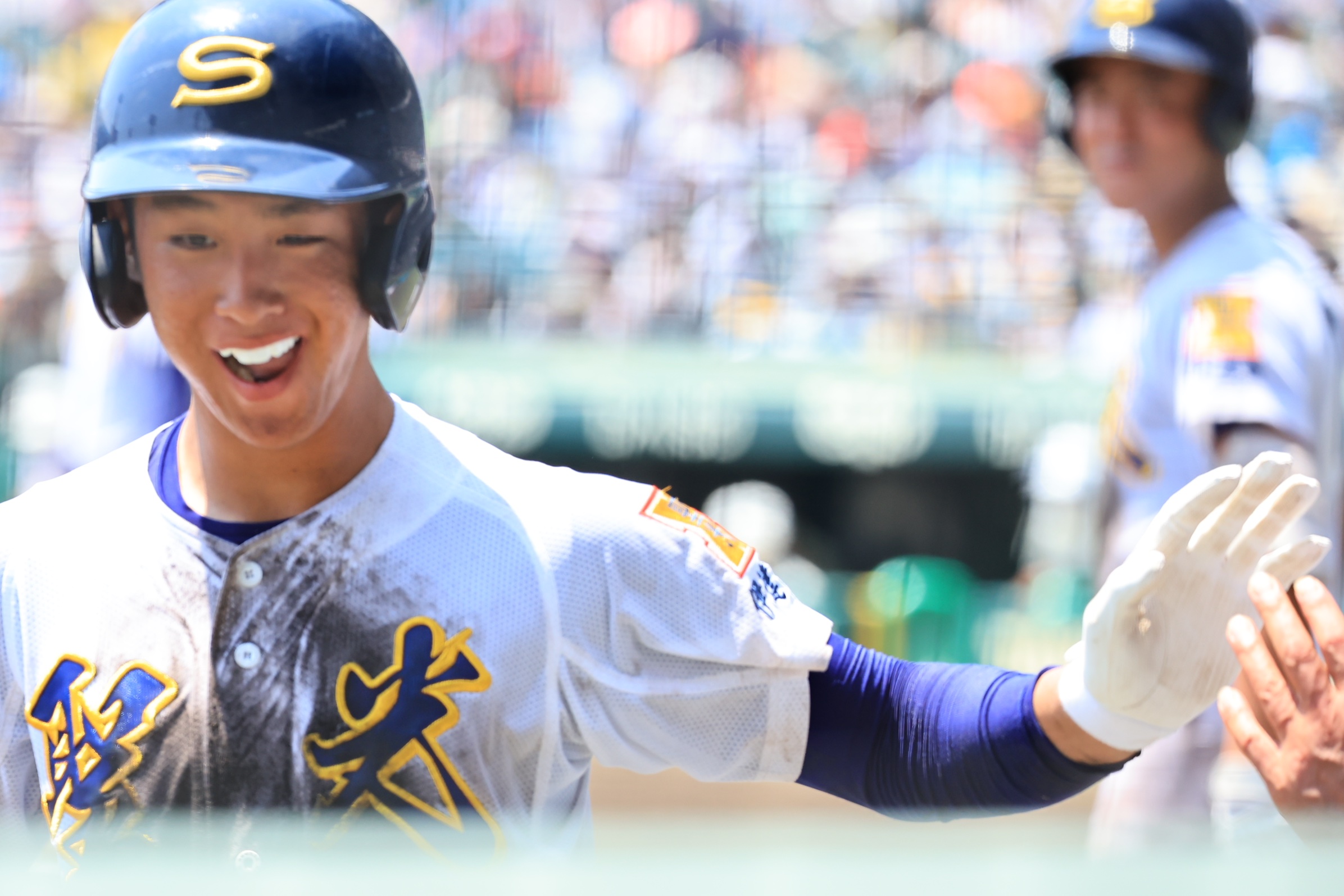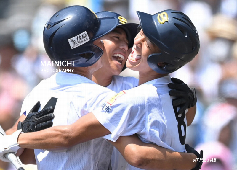 写真は #高中一樹 選手の逆転ツーランと、応援席に駆け出して喜ぶ聖光学院の選手たち。