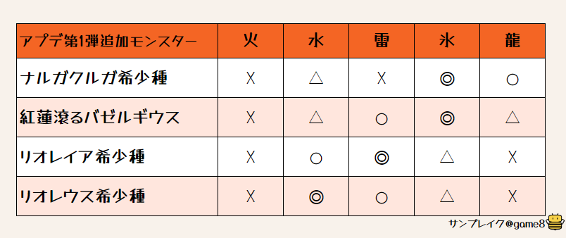 アプデ第一弾追加モンスターの弱点早見表です!