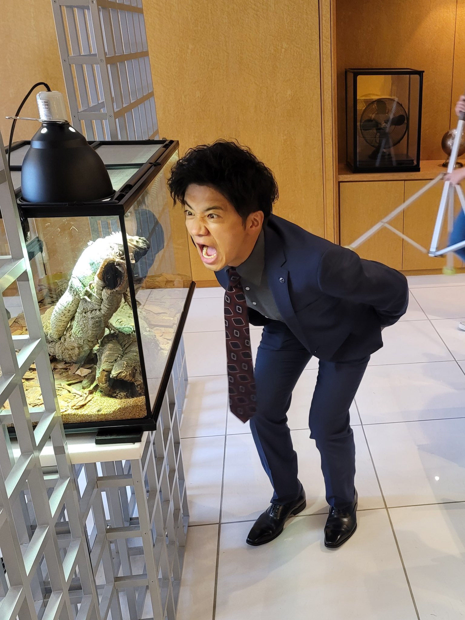賢治(#光石研)の部屋にいるサンエステバントゲオイグアナ(通称トゲオくん)を威嚇する⁉️#和田正人 さん