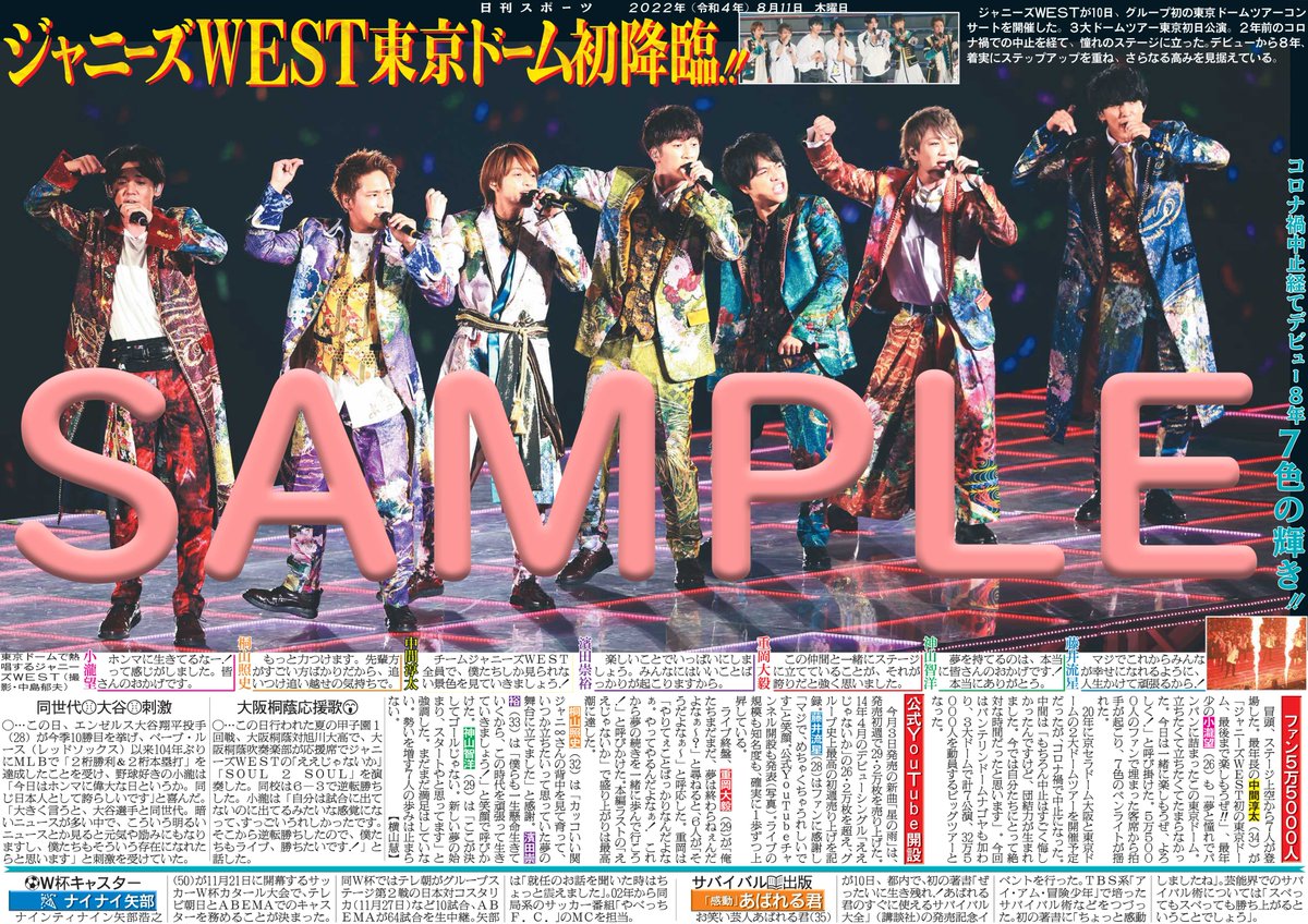 #ジャニーズWEST 初の東京ドーム公演を報じた日刊スポーツ紙面を全国のコンビニマルチコピー機で販売中。