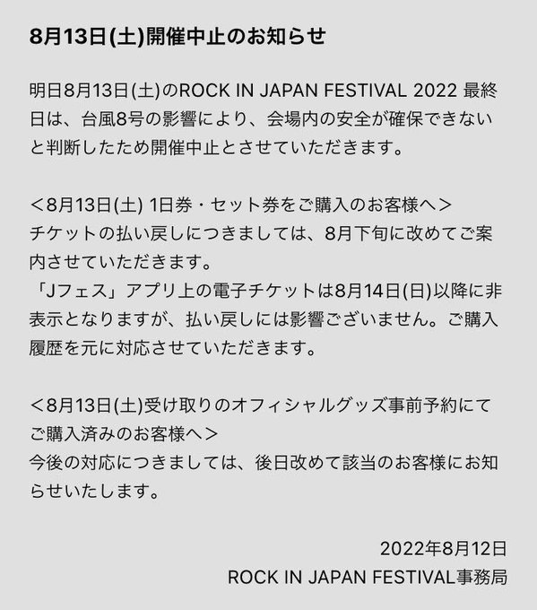 明日8月13日(土)のROCK IN JAPAN FESTIVAL 2022 最終日は、台風8号の影響により、会場内の安全が確保できないと判断したため開催中止とさせていただきます。