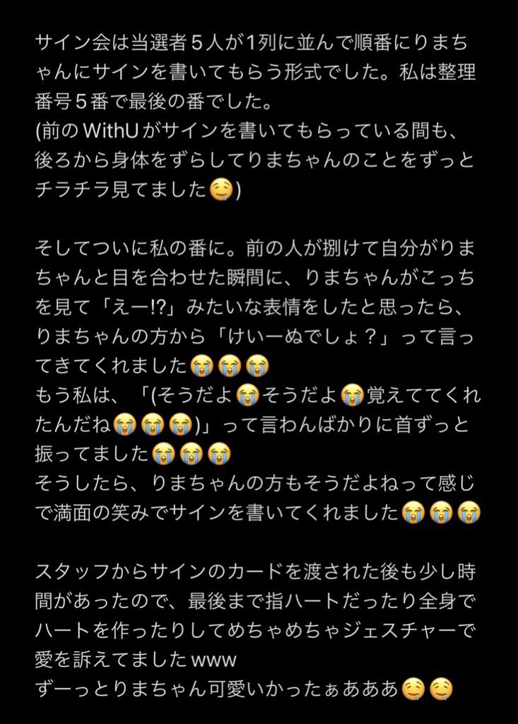 リオちゃんがMCで私がWithUの立場だったら辛いよ!好きなアイドルができたのに2年も会えないなんて!!私だったら早く会いたいと思うもん!だから今までずっと応援してくださって本当に感謝してます。的な事を言っていて本当に涙が止まらなかった。応援しててよかった。