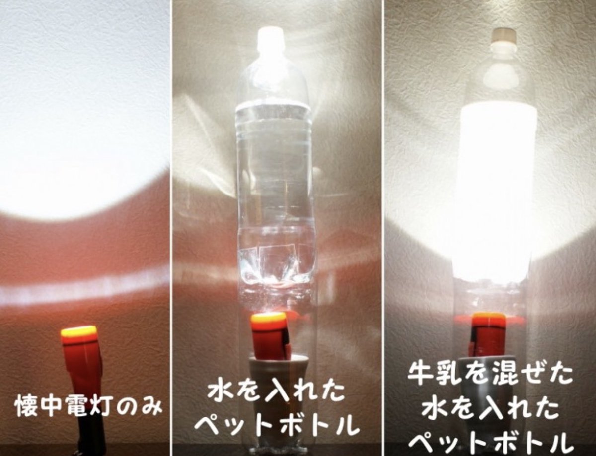 水が入ったペットボトル(2L)に牛乳10mlを入れてよく混ぜ、ライトをつけたスマホの上に置くと、光が粒子で拡散されキレイに光り照明になる(500mlだと2.5ml)