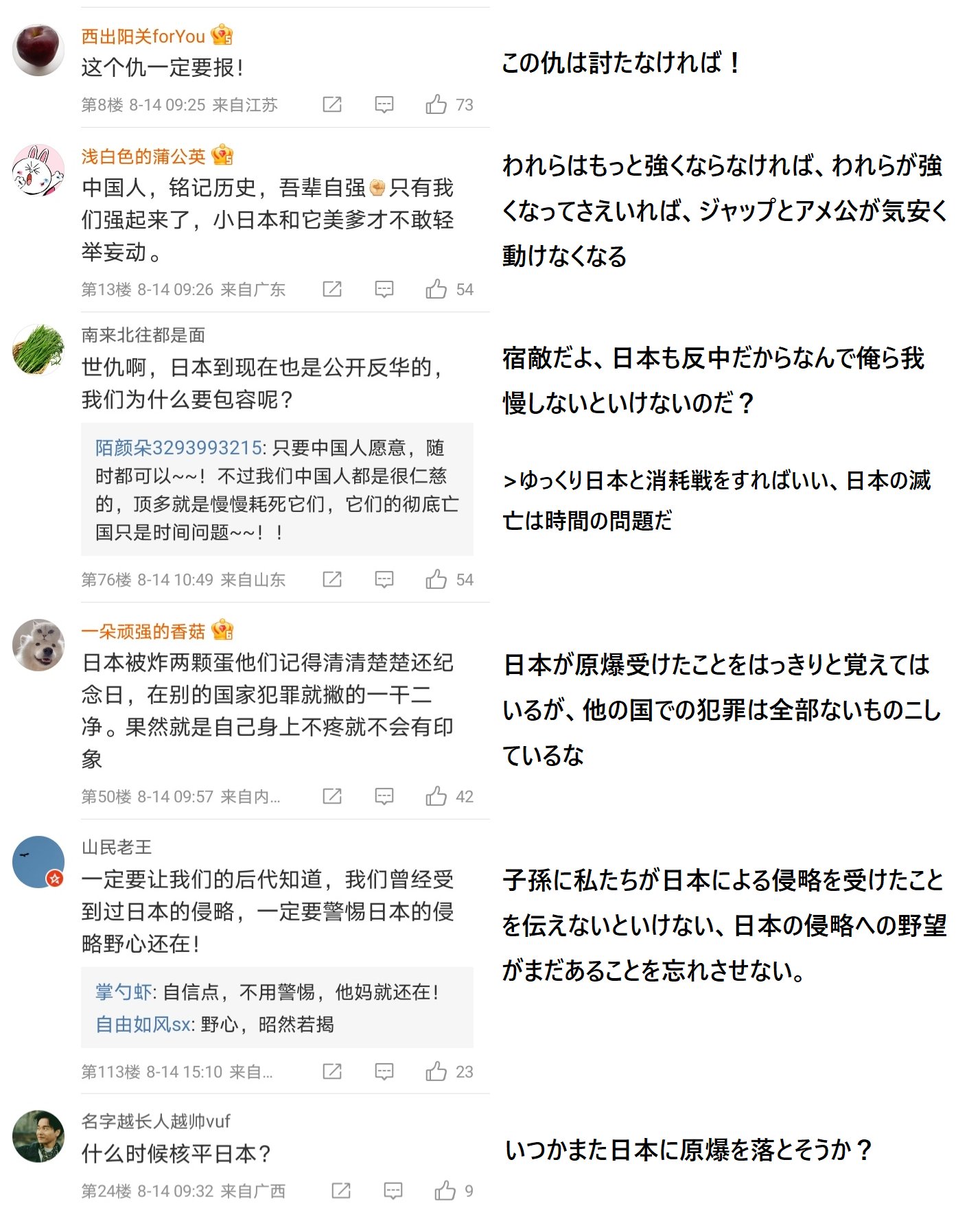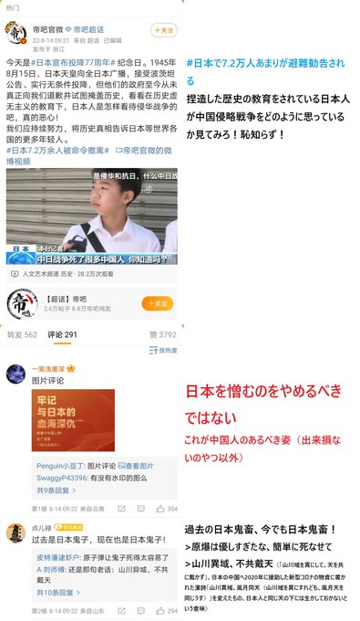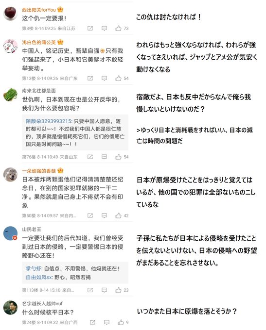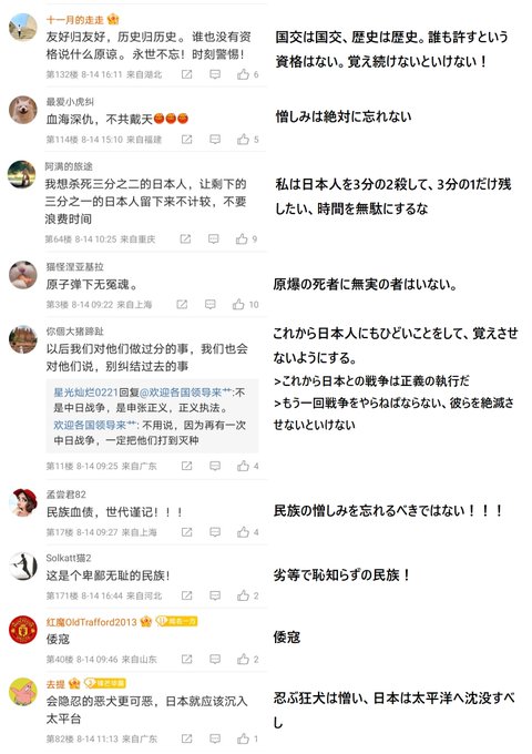 中共のヘイト教育とうそだらけの歴史教育で中国人は日本人には憎しみしか覚えていない。平和の大切さよりも、仇を討つ戦争を起こそうと思っている。