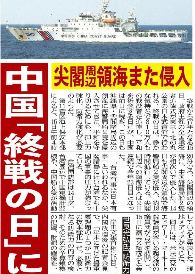 終戦から77年、戦没者を追悼し、平和を祈念する「終戦の日」に、中国は前日に続き、沖縄県・尖閣諸島周辺の領海に海警局船2隻を侵入させてきました
