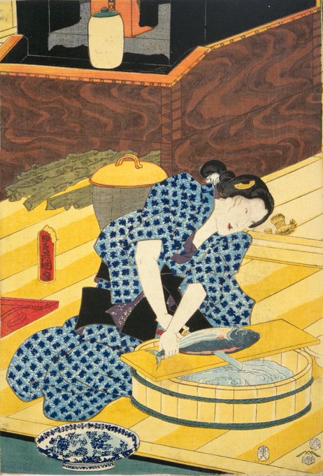 画像は台所でカツオを下ろしている女性を描いた作品です。#豊国 作。#ndldigital pic.twitter.com/pG3lCo4fhl