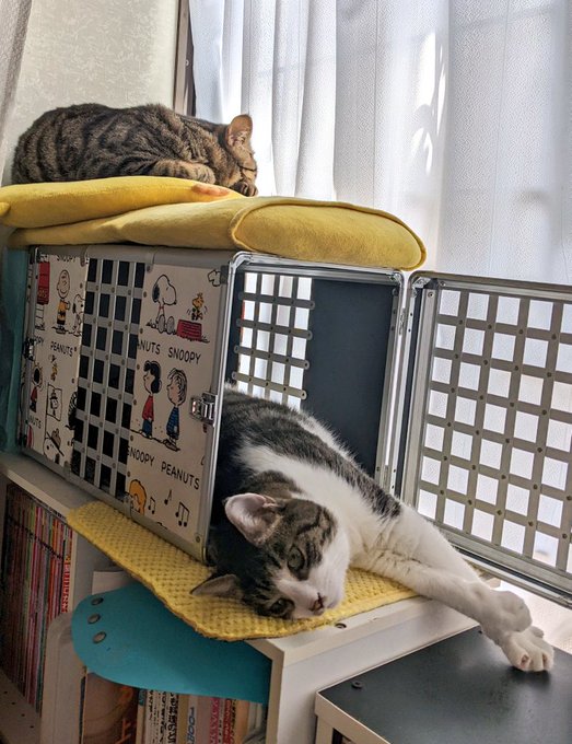 キャリーでまったりのレンちゃん&多分、一緒に入りたかったのに拒否され仕方なく上で寝ているリクちゃん😂