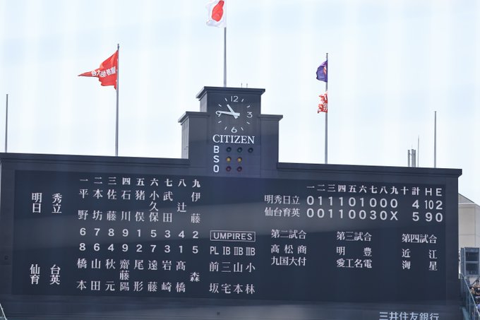 #仙台育英 明秀日立との仕掛け合い、5-4で制す。7回裏に押し出し2つ、犠牲フライで3点を奪っての逆転劇!序盤から盗塁、スクイズ。機動力と小技を終盤まで相手に意識させ、プレッシャーを掛け続けた戦いぶり。4人目の髙橋煌稀がテンポ良く、見事に相手打線を封じた。ベスト8一番乗り、おめでとう!! pic.twitter.com/e6JHOrTlLe