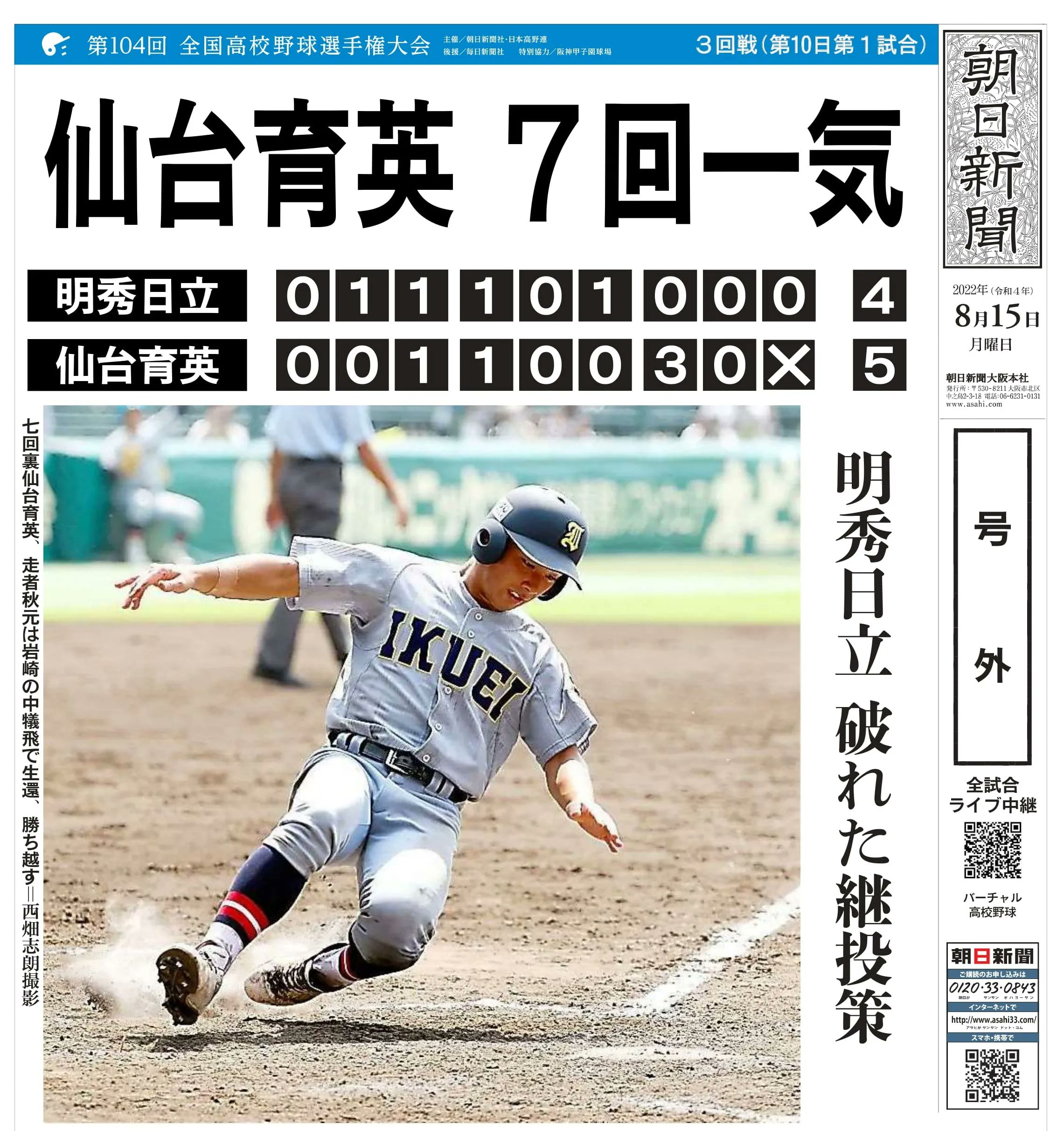 15日、第104回全国高校野球選手権大会3回戦 #明秀日立 4-5 #仙台育英