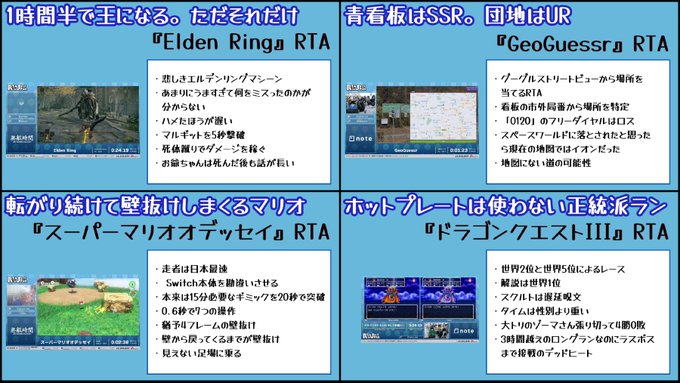 そろそろ走者振り返り記事上がる時期だと思うんですけど、頼むから「RTA in Japanに出た話」とかじゃなくて、走ったゲームの名前を記事タイトルに入れて欲しいです!!!
