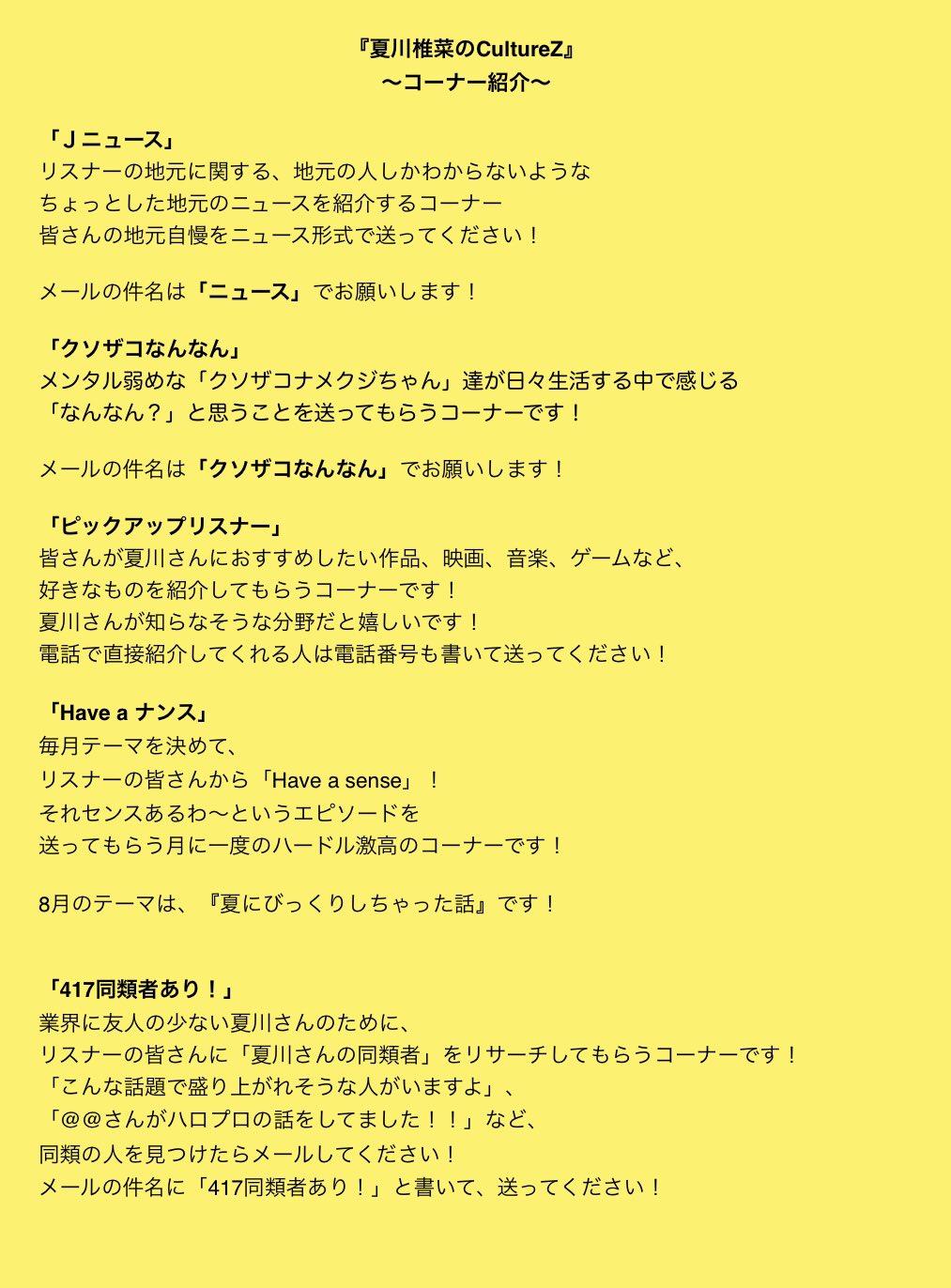 各コーナーへのメールも募集中です!