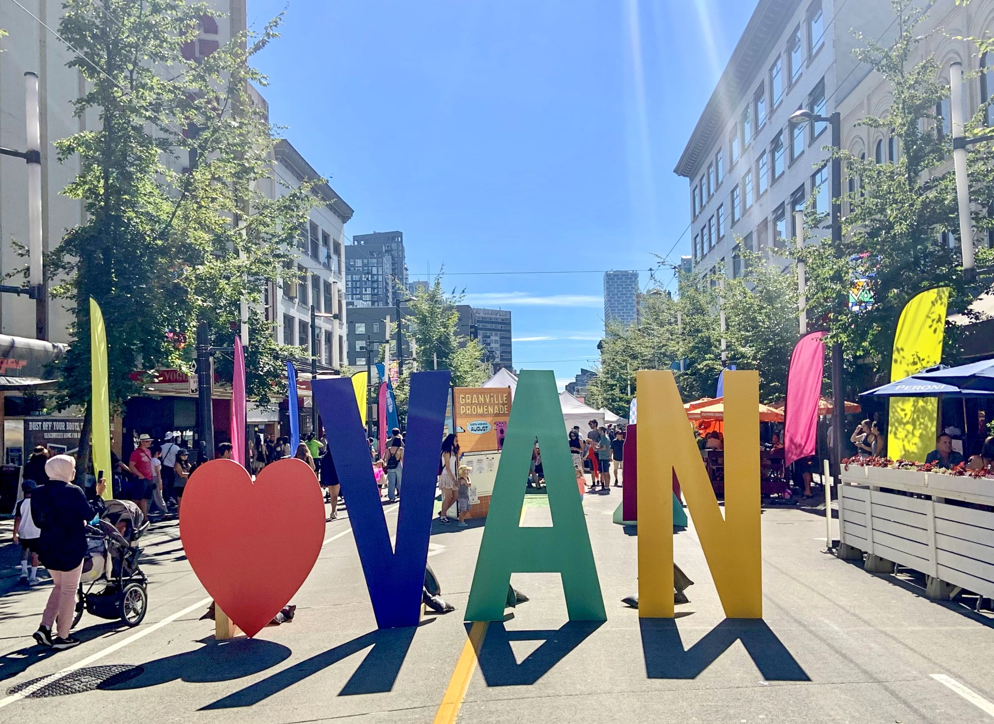 8月の週末は、どこかしらで何か野外イベントが行われています。バンクーバーのダウンタウン地区のグランビル通りでは、道路を閉鎖して子供の遊べるスペースがあったり、コンサートなどが行われていました。歩いているだけで日焼けするような太陽です。