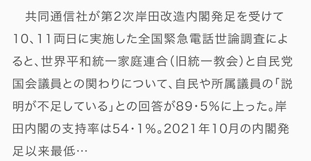 統一教会と自民党との関係説明を求める約90%