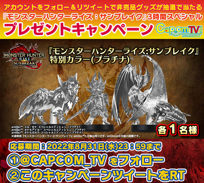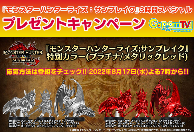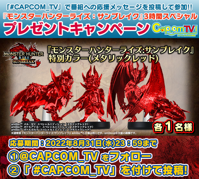 「amiibo™『モンスターハンターライズ:サンブレイク』特別カラー」(メタリックレッド)が抽選で当たるキャンペーンは8月31日まで!リンク先のアーカイブを見て感想を「 #CAPCOM_TV 」をつけてつぶやけばOKです! youtu.be/OkQcPpKgAfE?t=… #CAPCOM_TV #MHサンブレイク pic.twitter.com/oKaAK05Ulr
